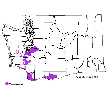 California Scrub-Jays can be found regularly year round in western Washington lowlands from Puget Sound south. They are occasional as far north as Seattle and have been found breeding north of Enumclaw and in Seattle in small numbers (King County). They can be found rarely all the way to the coast in Grays Harbor County and east to Lyle in Klickitat County. Ridgefield Wildlife Refuge in southwest Washington is a good location for finding them.