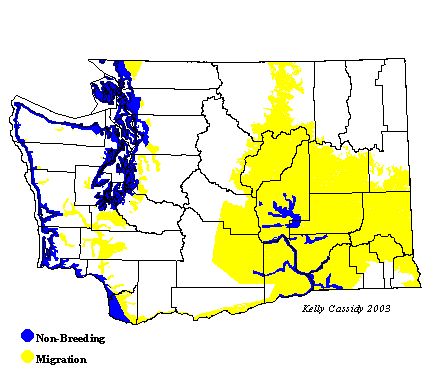 On the coast, Dunlin are rare throughout the summer. Fall migrants start showing up at the end of September. By October, they are common, and remain common through mid-May. Numbers peak at the end of March into April, as birds that wintered farther south join Washington's wintering birds before heading to the breeding grounds. By the end of May they are rare. They can be found in all the large coastal bays, but are usually patchily distributed, with thousands of birds in one spot, and none in a nearby, seemingly comparable area. Large flocks can usually be found, however, in Bellingham Bay (Whatcom County), Skagit Bay (Skagit County), Grays Harbor (Grays Harbor County), Willapa Bay (Pacific County), and the Columbia River Estuary (Pacific County). Most of these areas support flocks of 5,000 or more throughout the winter. The flock in Grays Harbor averages about 30,000 birds, with numbers much higher on occasion. Dunlin can also be seen in smaller flocks throughout the Puget Trough in winter. They are uncommon in eastern Washington during migration, with more moving through that region in the spring (from mid-April to mid-May) than fall (October). Small numbers also winter in eastern Washington, particularly at the Walla Walla and Yakima River deltas.