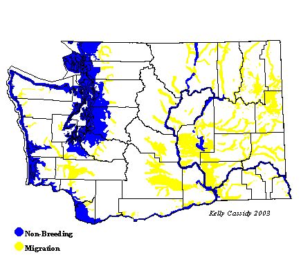 On the West Coast, dispersal from breeding colonies in British Columbia begins in late July. Migrants heading south start showing up along the Washington coastline in August, and numbers increase throughout the fall. Herring Gulls can be found year round as far north as Alaska, although young birds are typically found farther south in the winter than adults, and it appears that only non-breeders are migratory. Spring migration occurs in Washington between late March and mid-May.